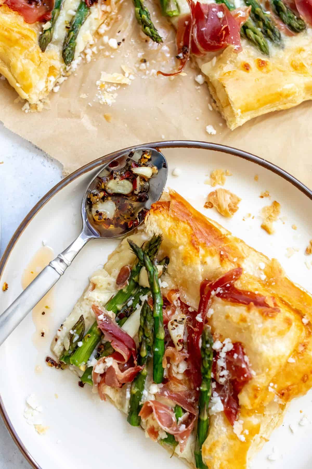 - Spoon the yummy oil with garlic over the asparagus puff pastry.Garnish with fresh basil, more parmesan and enjoy right away!