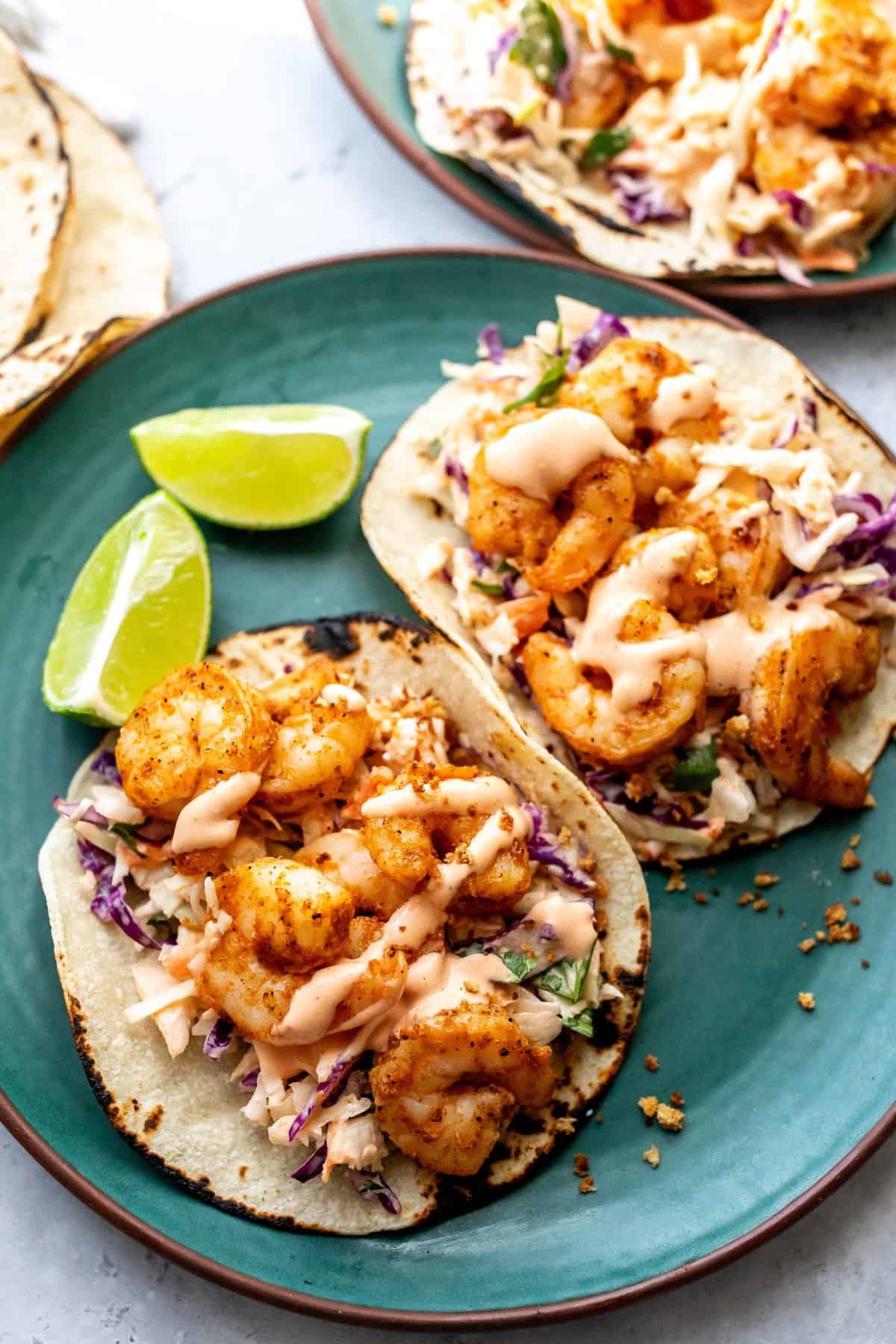 Baja Shrimp Tacos are seasoned well, served over creamy spicy coleslaw. Ready in 30 minutes and a fan favorite everyone will love. Full flavor but half the calories. These tacos will take over your table weekly with how easy they come together. They are healthier than the traditional, flavor blasted, have a little crunch from toasted panko and husband approved!