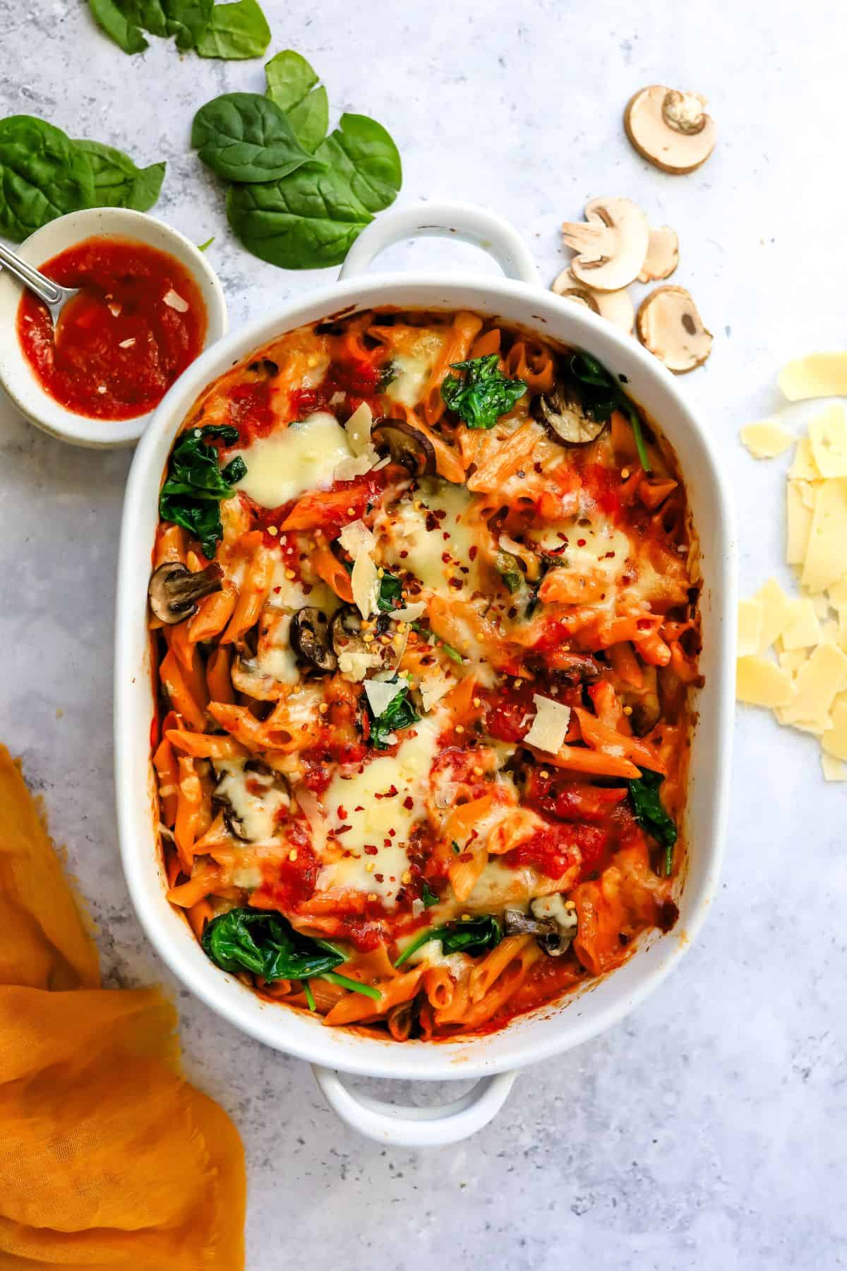 - Step One. Preheat oven to 375º. In an 8 x 11 or 9×9 baking dish, add dry pasta, red sauce, water (I fill the empty sauce jar with the water and shake it to get more sauce out). Add in seasoning, mushrooms, spinach. Carefully, gently mix together in the dish. Cover the dish tightly with tin foil.