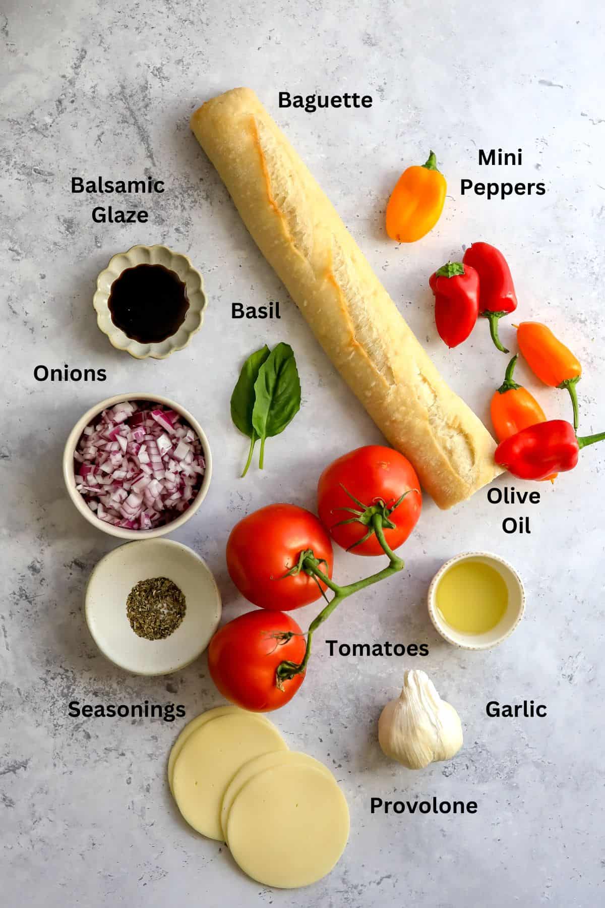 - Baguette. This will be sliced thin and toasted to hold/serve the balsamic bruschetta.
