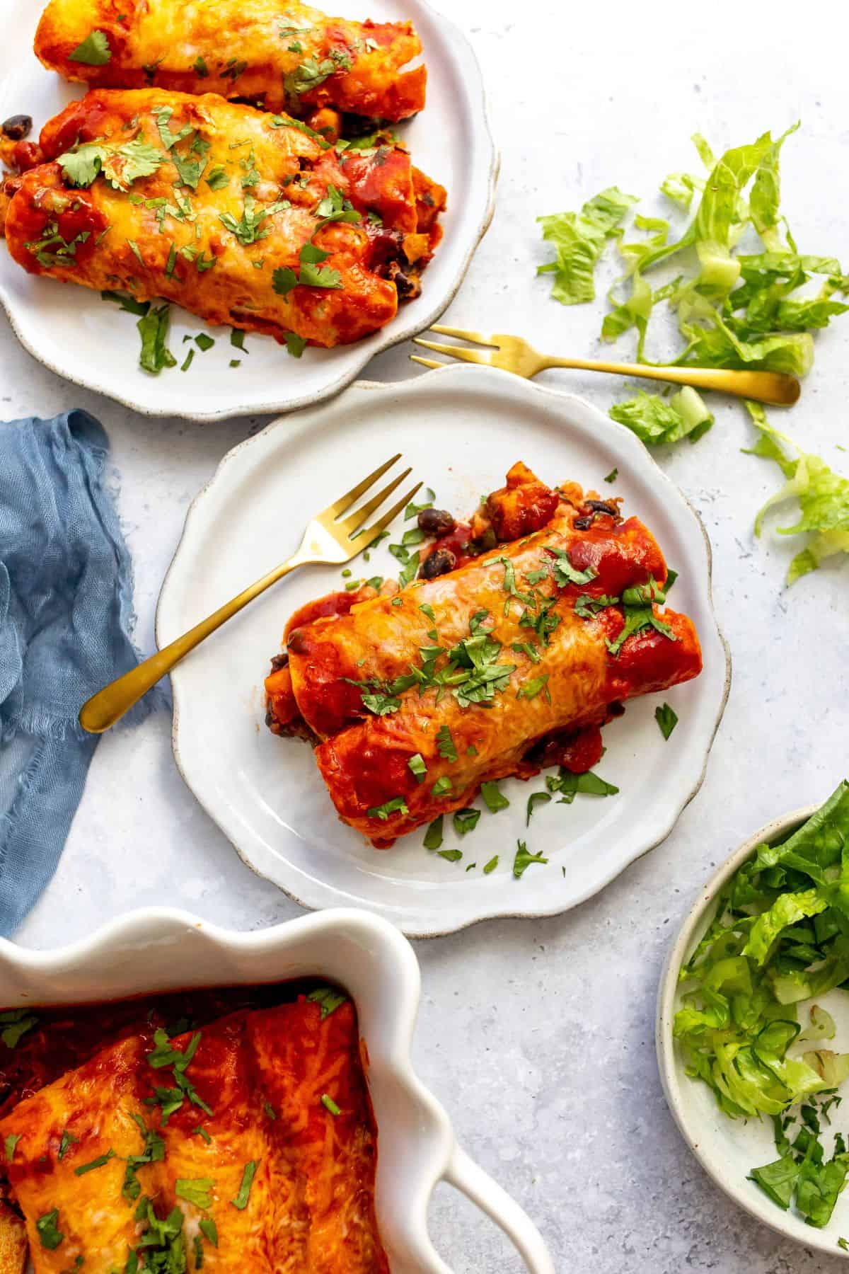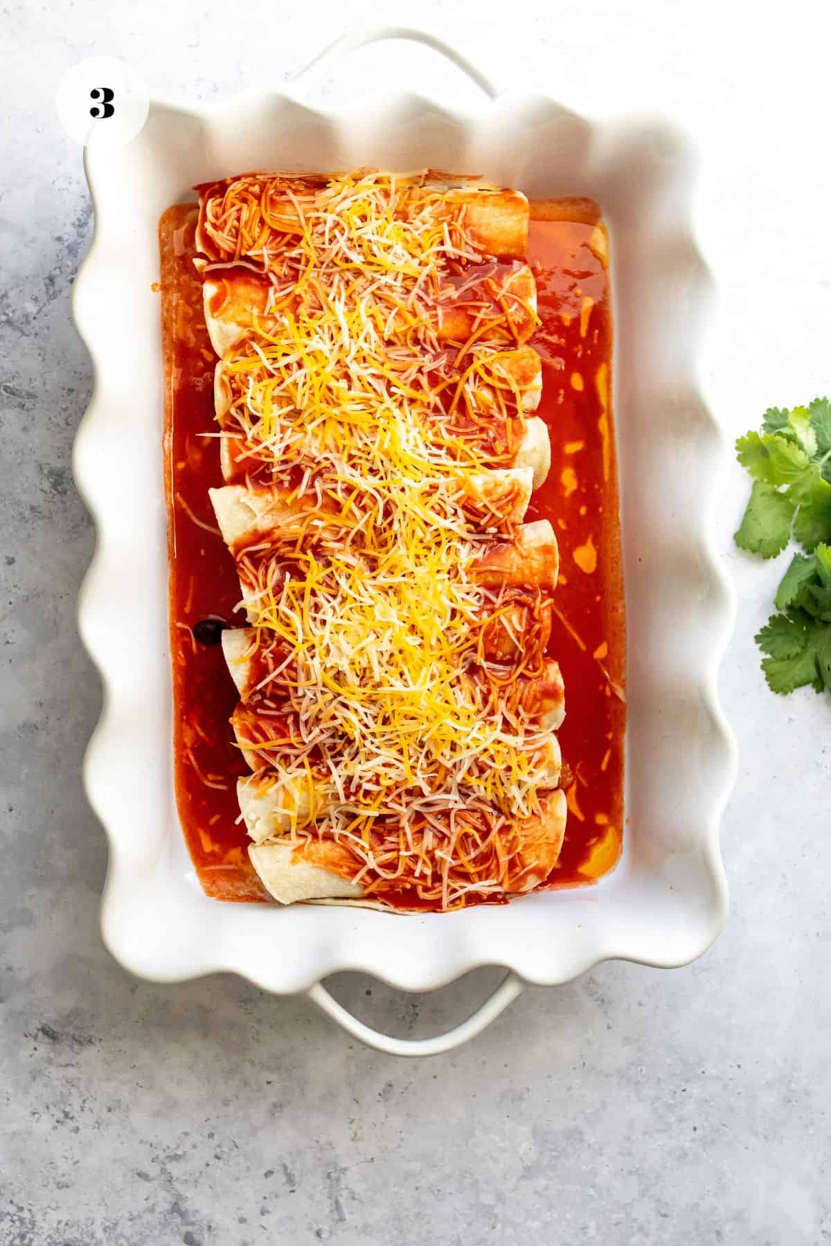 - Once they are all ready and stuffed, pour the leftover enchilada sauce over the rolled tortillas and sprinkle well with shredded cheese. Bake for about 20 minutes or until the cheese is melted, and the sauce is bubbling. Garnish with chopped cilantro. Serve with your favorite toppings and enjoy!