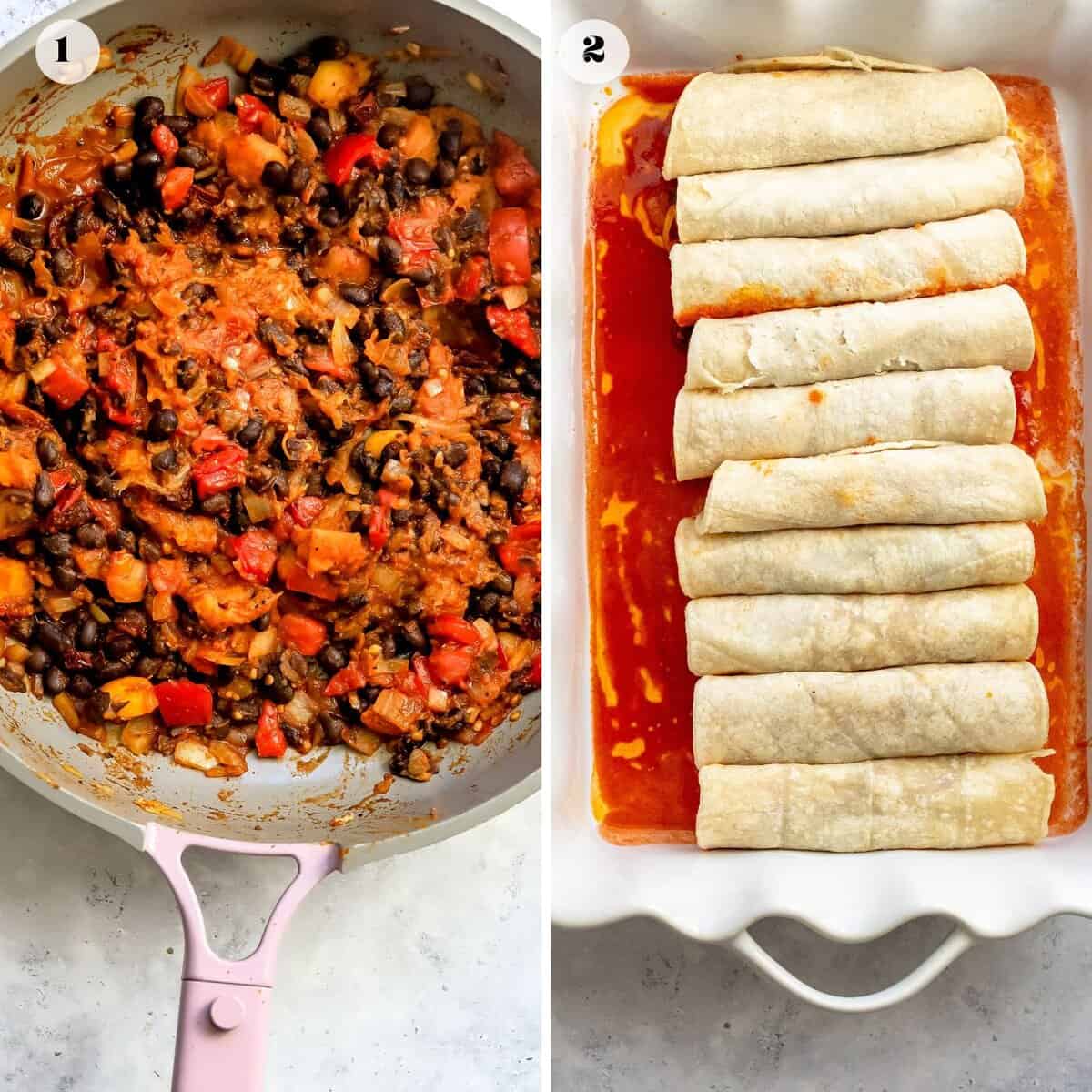 - Sauté on medium heat for about 4-6 minutes, until the seasonings are fragrant feel free to mash everything together just a bit so it fits into the tortillas better. Take it off the heat and prepare the vegetarian enchiladas.