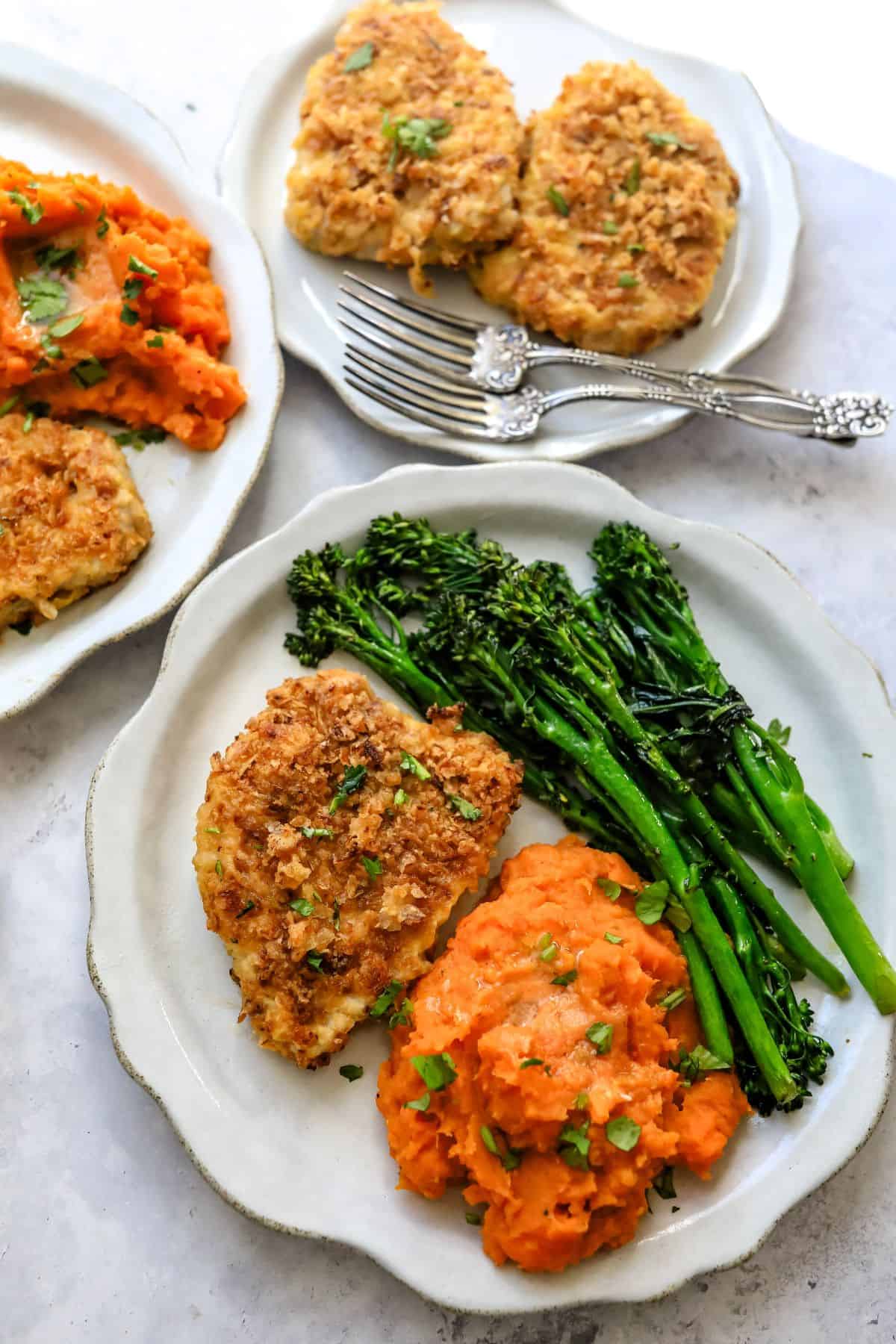 These crispy baked pork chops are such a knockout savory meal and they pair great with so many sides. A few of my favorites are: Parmesan Baked Brussel Sprouts, Charred Broccoli, Honey Balsamic Brussel Sprouts.