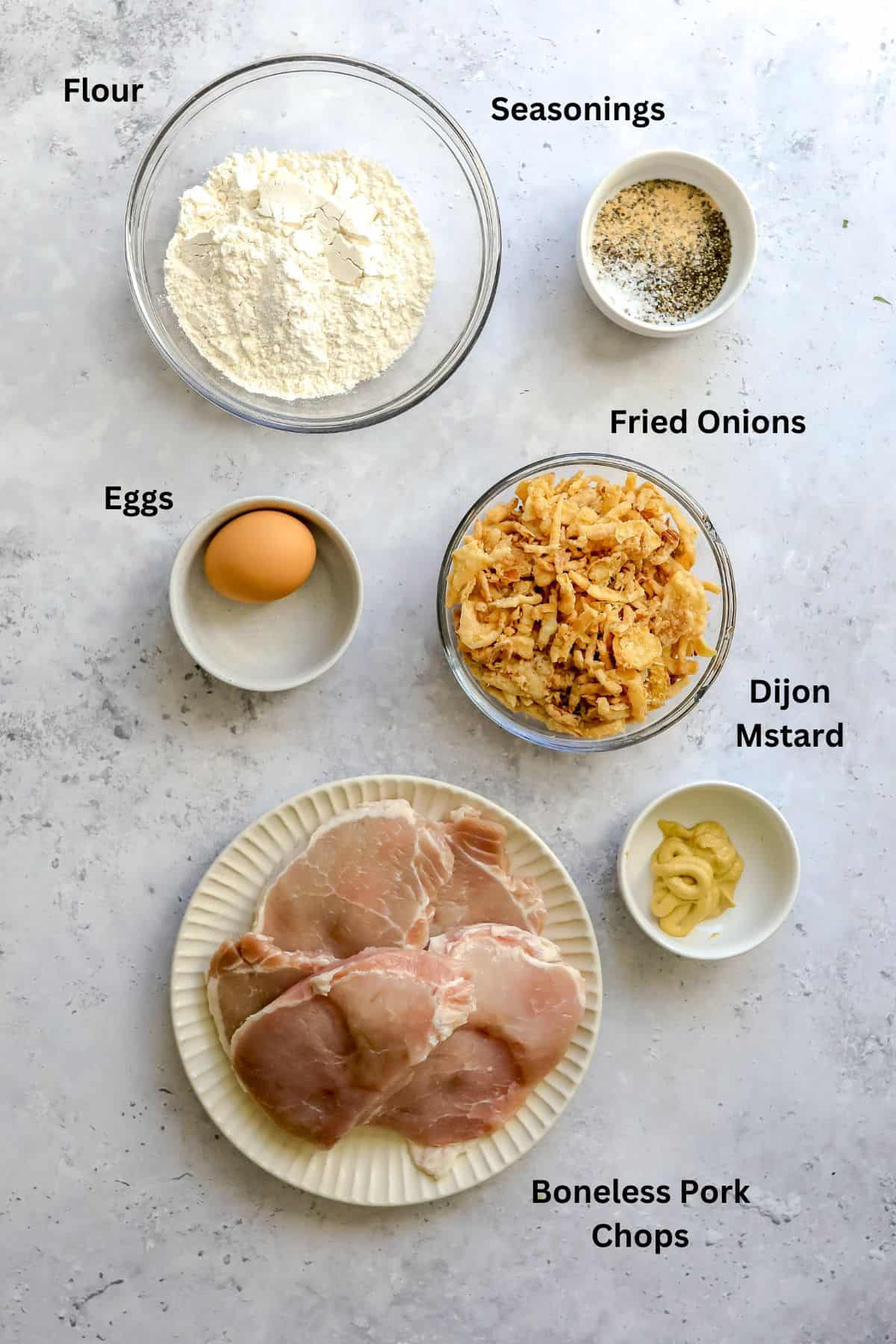 - Step Two. Prepare three bowls to dredge the pork chops in. Combine garlic powder, and salt and black pepper with flour. Blitz the fried onions in a food processor just to help break them up. Add them to a shallow bowl.
