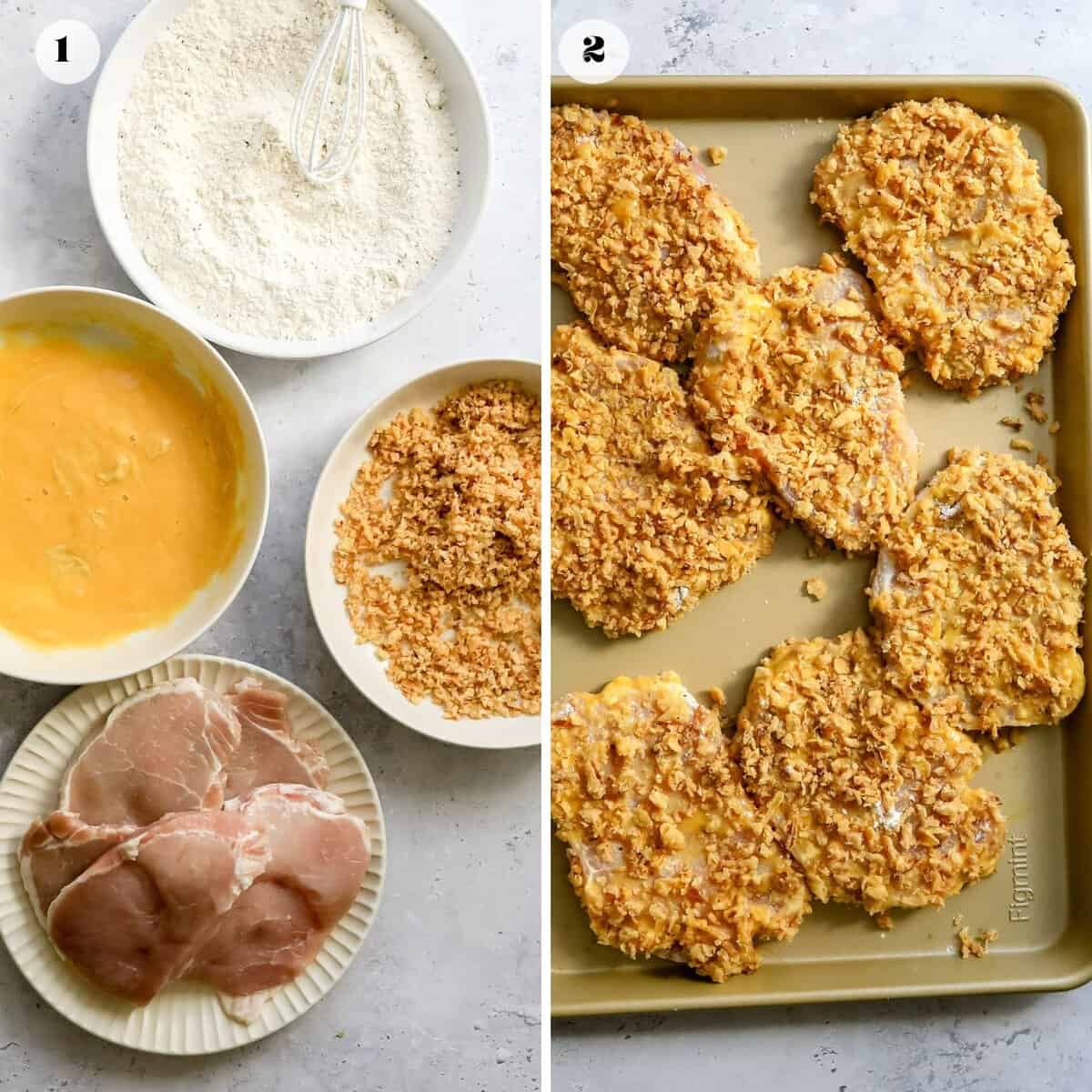 - Prepare the pork chops. Pat the pork chops dry with a paper towel and lightly dredge in flour/seasonings first. Next, dip the pork chop into the egg, making sure to coat all sides. Dip the pork chop into fried onion (or breadcrumb) mix.
