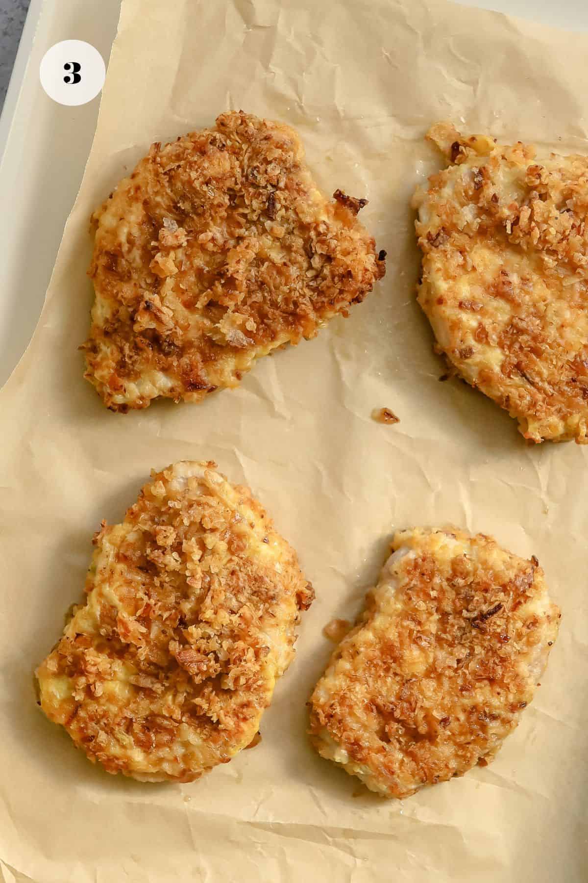 - Bake the pork chops. Add them to parchment paper and bake! Let them cool a bit before serving to help keep the coating on well.