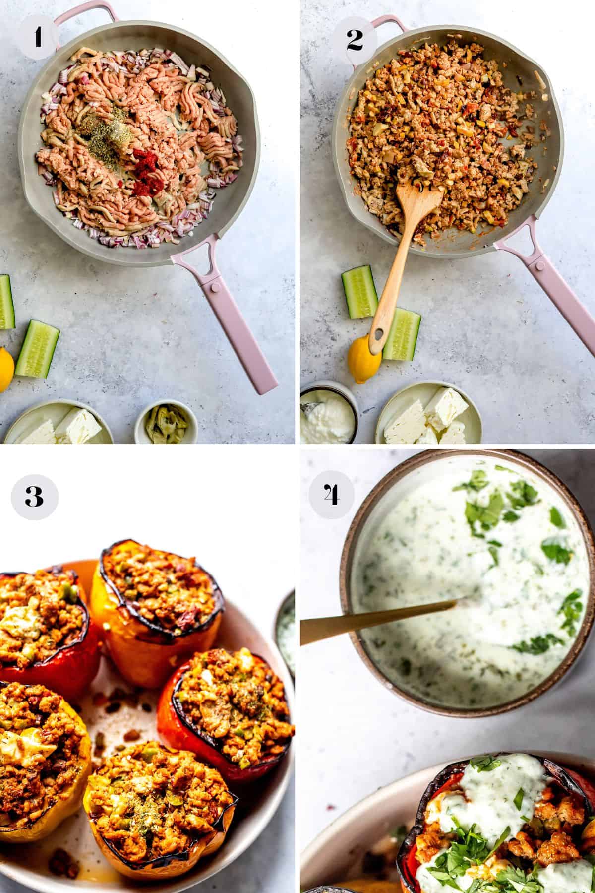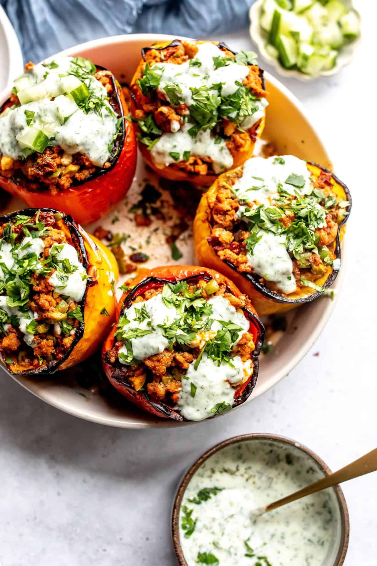 - Once the peppers have cooled a bit to touch, stuff the peppers! Stuff them to the brim with the ground turkey and pop back into the oven at 400º for about 10-15 minutes. Make the tzatziki while they bake.