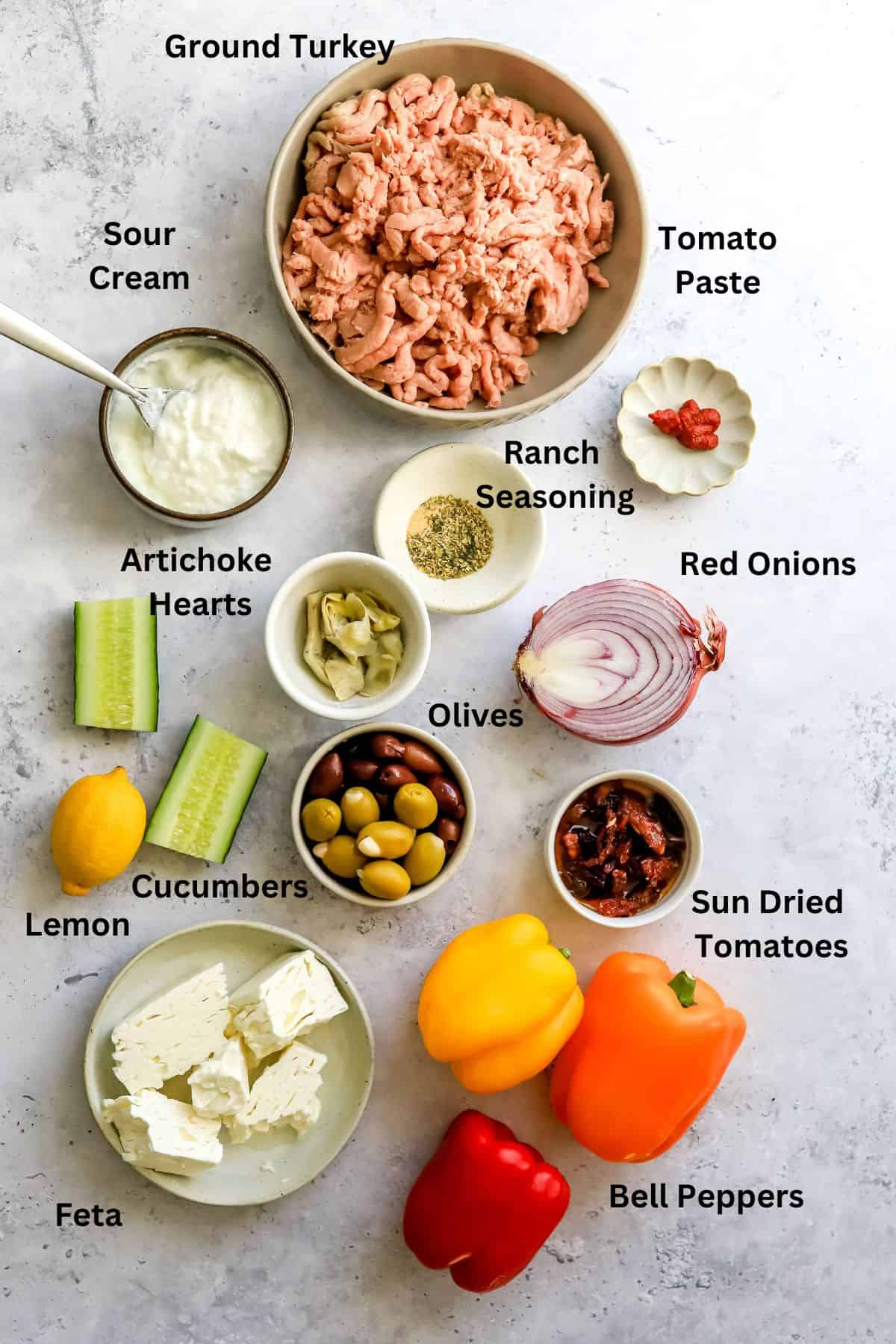 These Mediterranean Ground Turkey Stuffed Peppers are a stand up culinary meal. The peppers are roasted until perfectly soft and the ground turkey is full of tangy feta, olives and ranch seasonings. The peppers are baked to perfection, they hold up well for meal prep and they have a tangy scratch made tzatziki. You will be reaching for this recipe on busy weekdays for the foreseeable future!