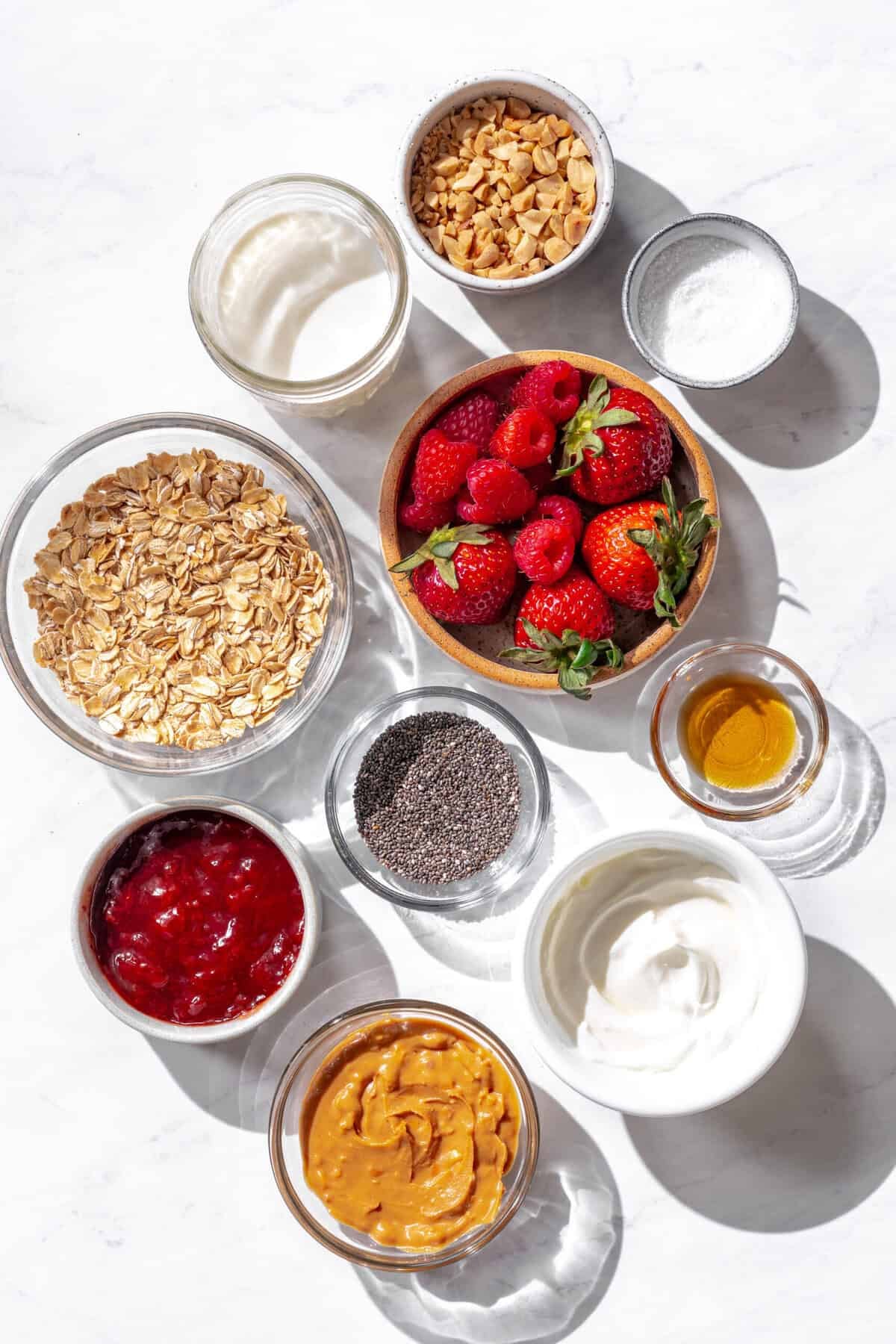 - Step Four: When ready to eat, top with strawberry jam, peanut butter, chopped strawberries or raspberries, and chopped peanuts.