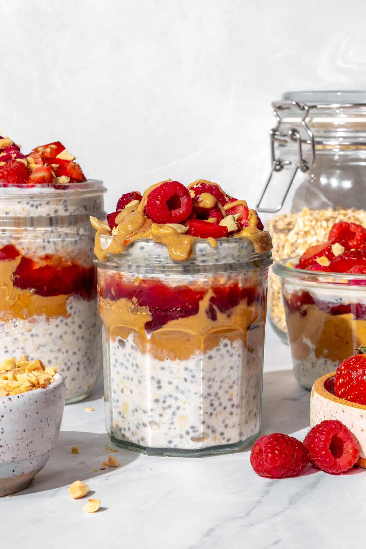 The oats and chia soak overnight to create a thick, creamy base, then get topped with strawberry jam, peanut butter, and fresh fruit in the morning. It’s the kind of breakfast you can prep once and enjoy all week.