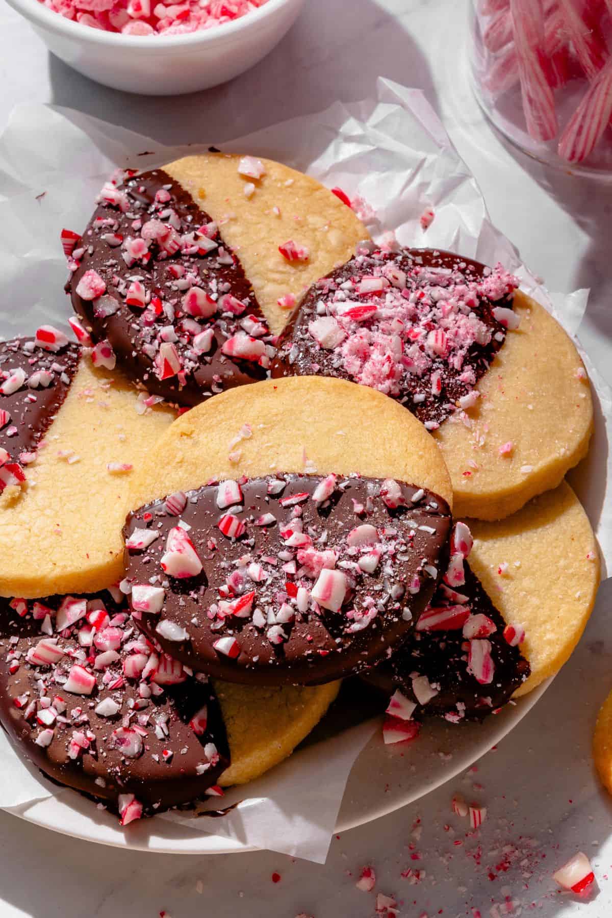Melt in your mouth shortbread cookies that are dipped in chocolate and sprinkled with peppermint candy. These cookies are the ultimate festive holiday treat for dessert or to add to your cookie plates. You will love how easy and quickly they come together plus they are so cute!