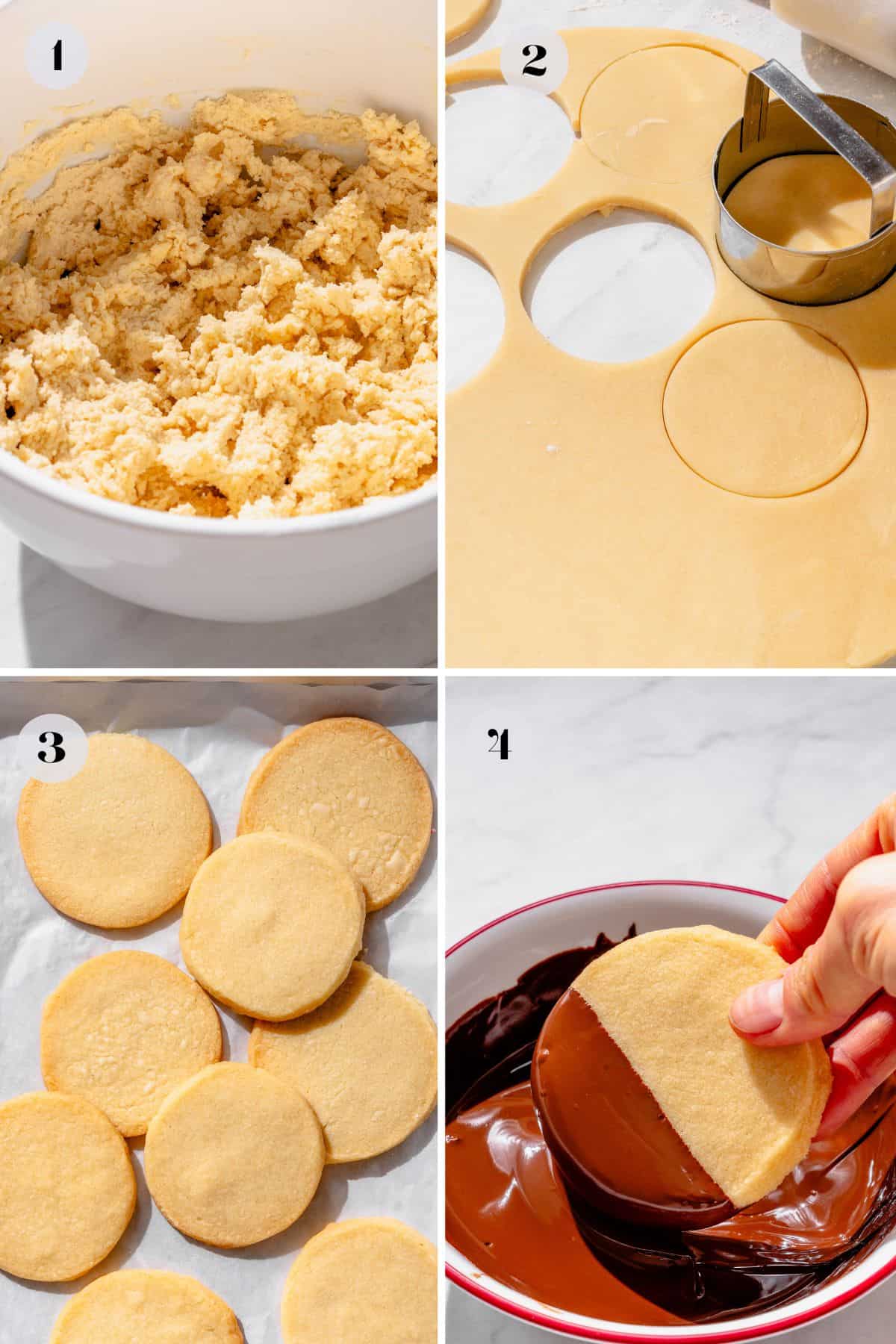 - Step One. (Photo 1) Make the shortbread cookies: Cream the softened butter in a stand mixer. Add the powdered sugar and vanilla and mix until well blended. Mix in the flour and salt continue to mix until the dough is crumbly. Mix slowly until a crumbly dough forms. It will look like crumbs in the stand mixer, but when squeezed together in your hands it should hold its shape.