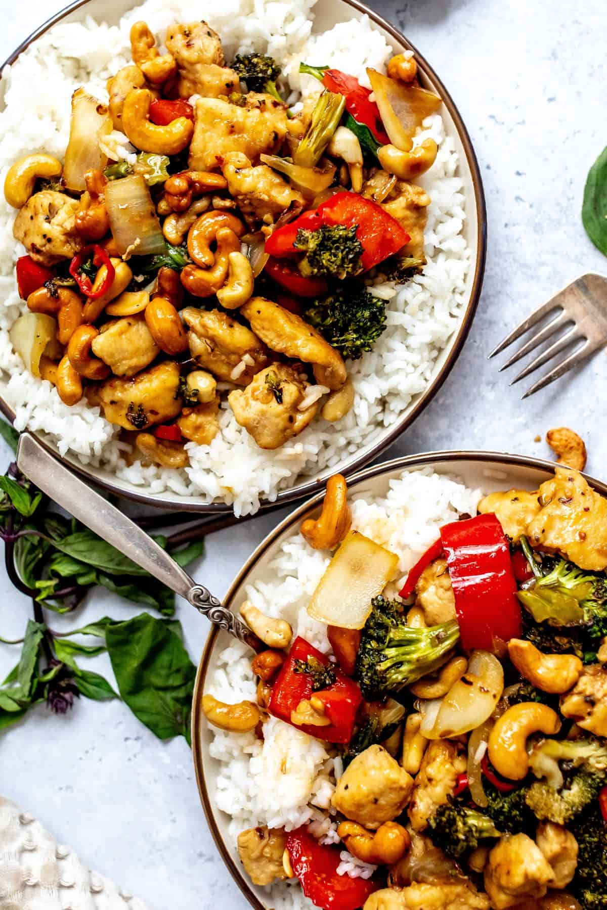 Thai cashew chicken is one of our favorite easy meals. It’s spicy, nutty and full of veggies, it’s a healthier version of the popular takeout dish. A simple weeknight meal you will be hooked on. Served over a bed of fluffy rice and toasted cashews in each bite. You can make this dish as mild or as spicy as you prefer, I like it hot! It’s satisfying and it keeps SO well making it great for meal prep. Also try my Salt and Pepper Chicken.