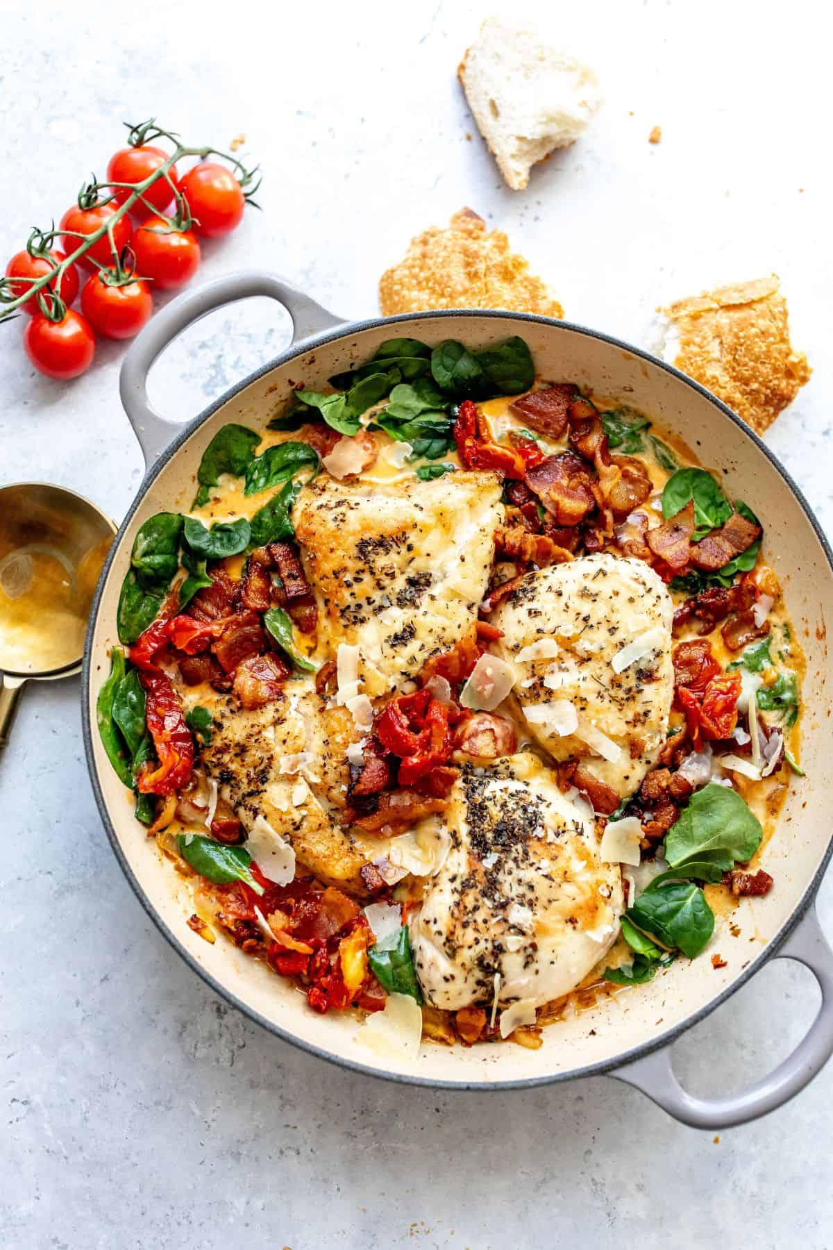 Tender Tuscan Chicken in a skillet with creamy decadent sauce and bacon bits. An easy weeknight meal to enjoy. Tuscan Chicken Skillet is a delicious and easy-to-make one-pan dish that features the flavors of the Italian region of Tuscany. It typically includes ingredients like chicken, sun-dried tomatoes, garlic, spinach, and a creamy sauce. You will love the flavors of this dish, they truly are unmatched!