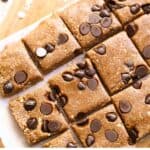 Place all the ingredients except chocolate chips into a food processor or strong blender. Blend for a few minutes, you may need to open the lid and loosen with a spatula a few times. The mixture should be thick and crumbly but hold together when you squeeze it with your hand. Once mixture is well blended, add in chocolate chips and pulse together lightly to keep chips in original form.